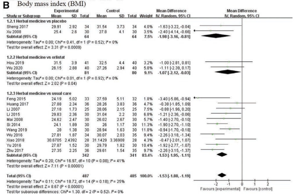 本篇研究共收錄16篇文章1052人,根據下表可以看出中藥對比於安慰劑/減肥藥/飲食運動,中藥組的BMI下降皆較為顯著,P<0.05,說明中藥對於減肥是有很好的效果,且文章中提到對於腰圍減少有不錯的效果。